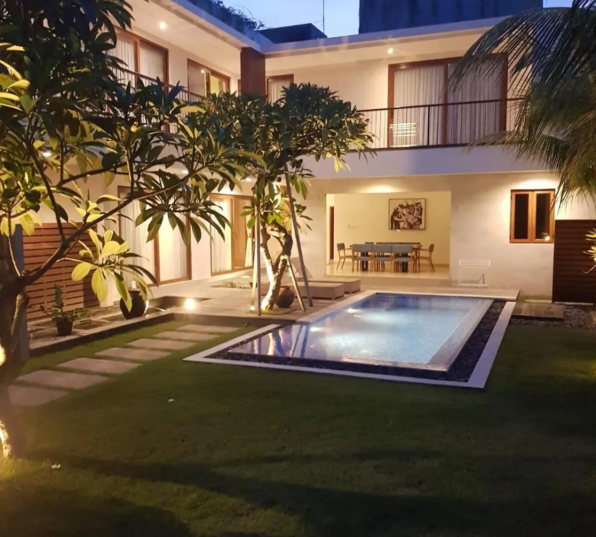 Villa Dharmatria设有私人游泳池,厨房以及5间卧室,俯瞰花园。